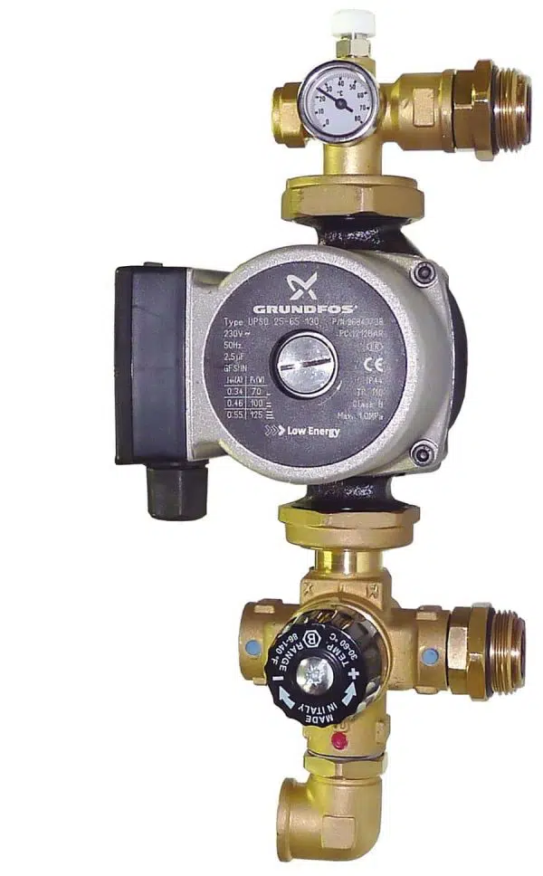 The pump pack allows the adjustment of the flow temperature to distribution manifolds. It is usually installed in heating systems, or radiators directly connected to manifolds. The unit includes adjustment of the flow temperature is done through a thermostatic mixing valve, manually set, which mixes the thermal fluid coming from boiler with the cold returning from the system. The pump, a 4-way thermostatic mixing valve, a fitting with temperature gauge and manual air vent, an adjustable elbow suitable for primary horizontal/vertical pipe connection, and fittings with hydraulic seals for manifold connection.